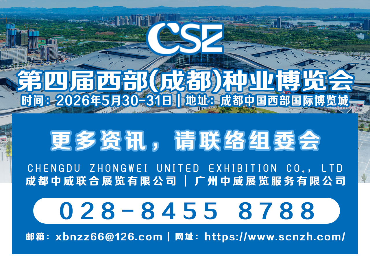 2026第四届西部(成都)种业博览会(简称:CSE2026)定于2026年5月30-31日在成都中国西部国际博览城盛大举办,招展招商工作正式启动!本届展会立足川渝核心农业产区,辐射陕甘宁及全国农业市场,广纳国内外优质种源、前沿育种技术与创新成果,搭建种业全产业链协同共赢平台,助力种业振兴与西部农业提质增效!